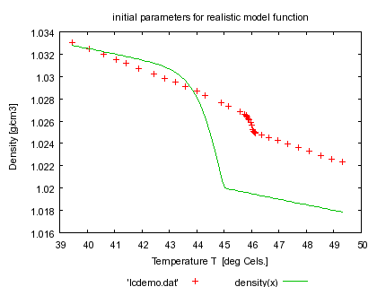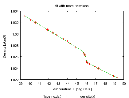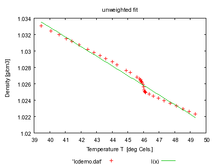 set title 'data for first fit demo' plot 'lcdemo.dat' set xlabel "Temperature T [deg Cels.]" set ylabel "Density [g/cm3]" set key below print "now fitting a straight line to the data :-)" print "only as a demo without physical meaning" load 'line.fnc' y0 = 0.0 m = 0.0 show variablesClick here for minimal script to generate this plot