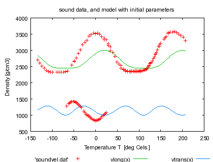 load 'hexa.fnc' load 'sound.par' set title 'sound data, and model with initial parameters' plot 'soundvel.dat', vlong(x), vtrans(x) # Must provide an error estimate for a 3d fit. Use constant 1 fit f(x,y) 'soundvel.dat' using 1:-2:2:(1) via 'sound.par' #create soundfit.par, reading from sound.par and updating values update 'sound.par' 'soundfit.par' print ""Click here for minimal script to generate this plot
