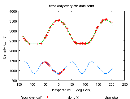 load 'sound.par' fit f(x,y) 'soundvel.dat' every 5 using 1:-2:2:(1) via 'sound.par' set title 'fitted only every 5th data point' plot 'soundvel.dat', vlong(x), vtrans(x) print "When you compare the results (see 'fit.log') you remark that" print "the uncertainties in the fitted constants have become larger," print "the quality of the plot is only slightly affected." print "" print "By marking some parameters as '# FIXED' in the parameter file" print "you fit only the others (c44 and c13 fixed here)." print ""Click here for minimal script to generate this plot