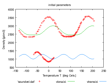 load 'sound.par' set title 'initial parameters' plot 'soundvel.dat', vlong(x), vtrans(x) fit f(x,y) 'soundvel.dat' using 1:-2:2:(1) via c33, c11, phi0 set title 'fit via c33,c11,phi0' plot 'soundvel.dat', vlong(x), vtrans(x) print "Here comes an example of a very complex function..." print ""Click here for minimal script to generate this plot