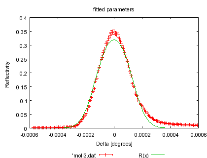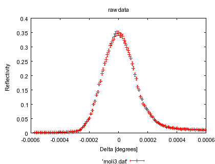 set xlabel "Delta [degrees]" set ylabel "Reflectivity" set title 'raw data' #HBB 970522: here and below, use the error column present in moli3.dat: plot 'moli3.dat' w e print "now fitting the model function to the data" load 'reflect.fnc' #HBB 970522: Changed initial values to something sensible, i.e. # something an experienced user of fit would actually use. # FIT_LIMIT is also raised, to ensure a better fit. eta = 1.2e-4 tc = 1.8e-3 FIT_LIMIT=1e-10 show variables show functionsClick here for minimal script to generate this plot
