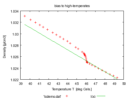 set title 'fit weighted towards low temperatures' plot 'lcdemo.dat', l(x)Click here for minimal script to generate this plot